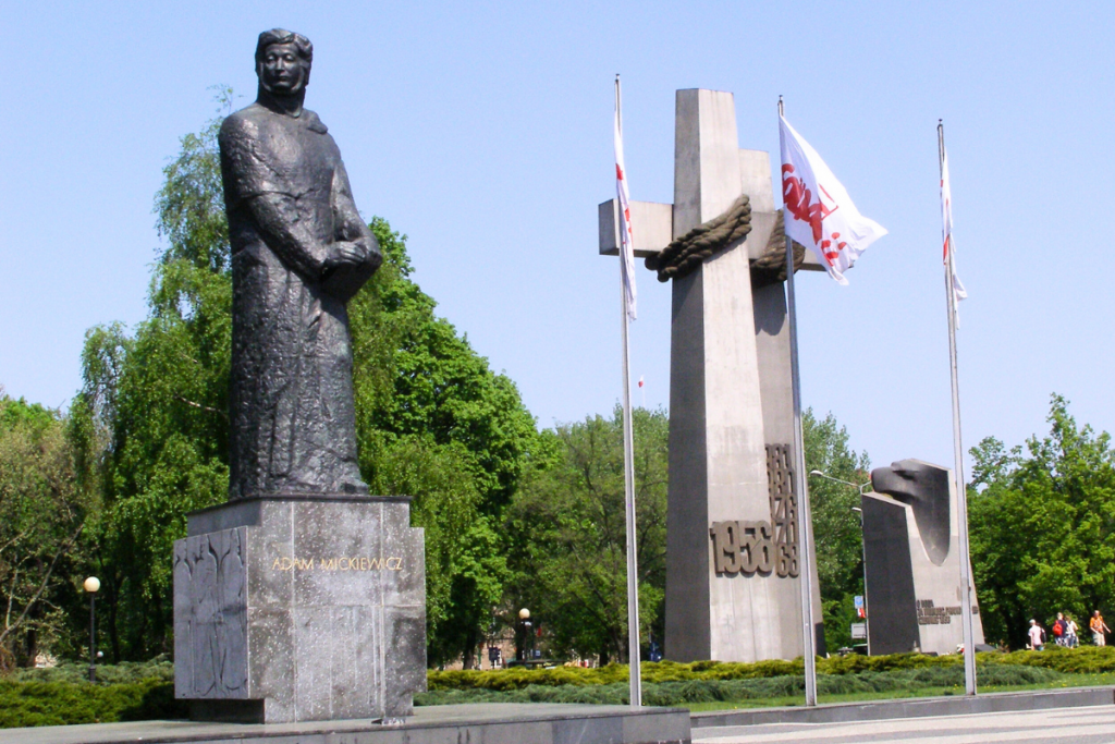 Statue von Adam Mickiewicz und Denkmal für die Opfer von 1956 vor der Universität